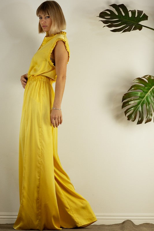 Satin pants set with ruffle sleeve detail elastic waist with wide-leg pants and front pockets. Quality that suits your style.