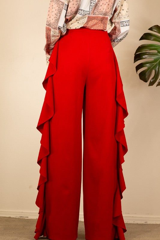 Your wardrobe just got a little hotter with the new addition of our sophisticated, chic red wide-leg pants with a side ruffle. These high-waisted button-up pants make a statement in any scene. Feel good fabric has some stretch.