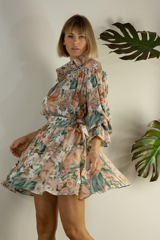 Obsessing over this garden party chic floral-inspired skirt set. Style for every occasion. Party, shower, or wedding this flowing print mini-skirt had a comfortable elastic waist. Matching top with collar and details galore. Hand wash cold, line dry.