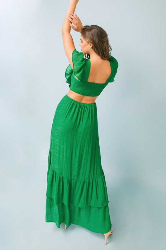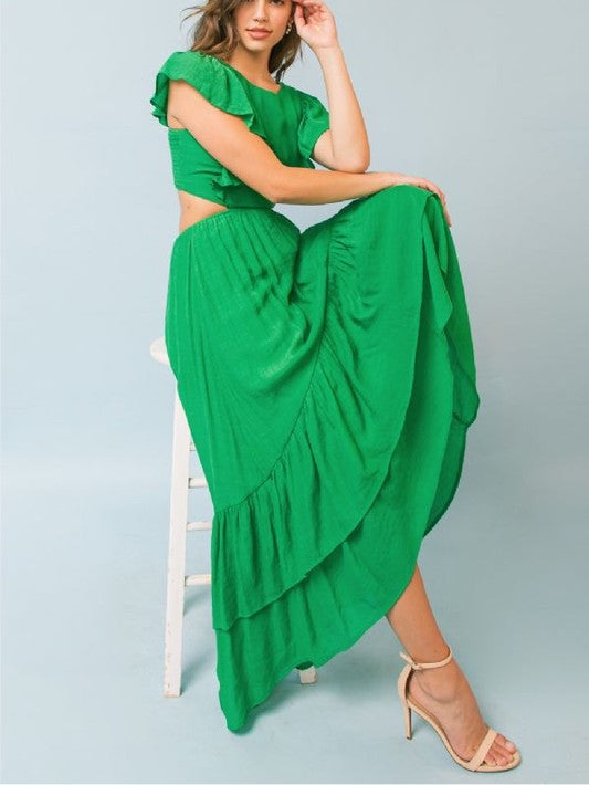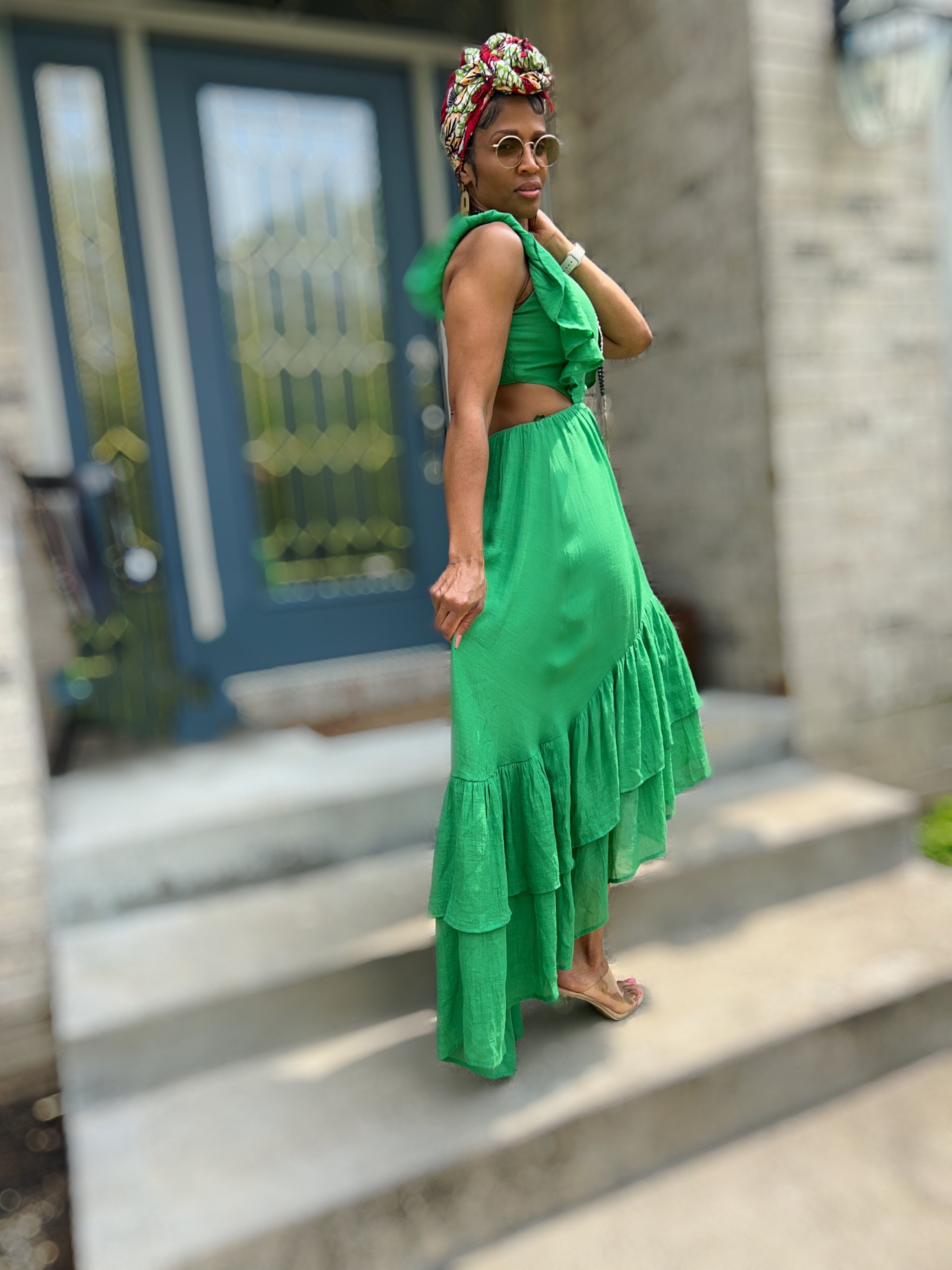 A dress for any occasion. This women’s solid green hi-low dress with side cut-outs and open back cut-out is the perfect brunch style or date night dress. Featuring a round neckline and double ruffle hem line. Comfy fit with elastic waist at back. Has lining. 100% polyester Wash cold line dry.