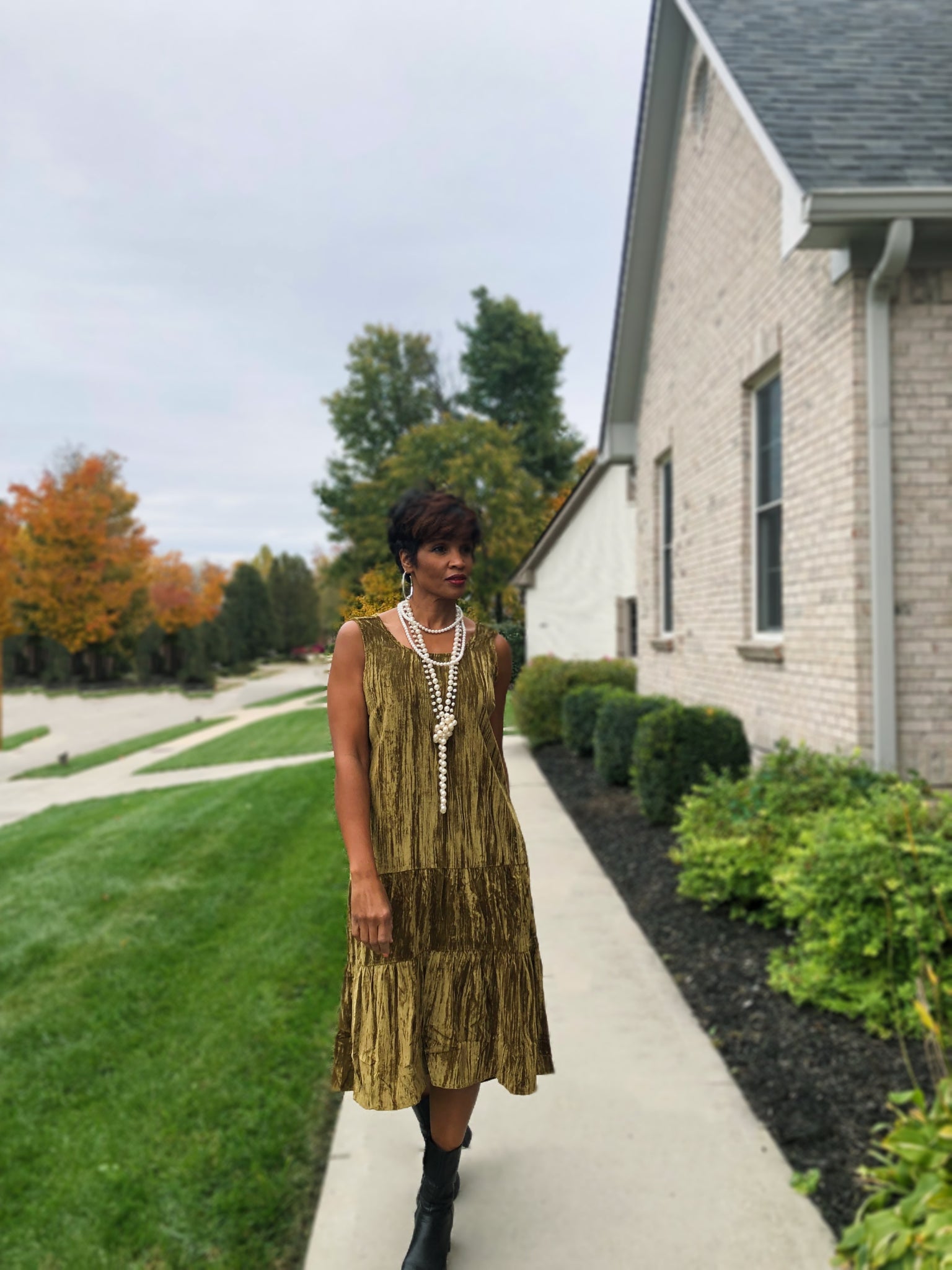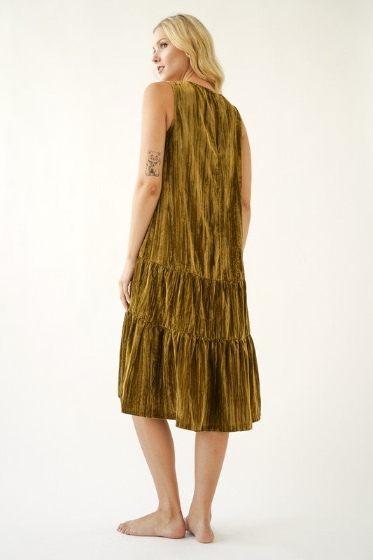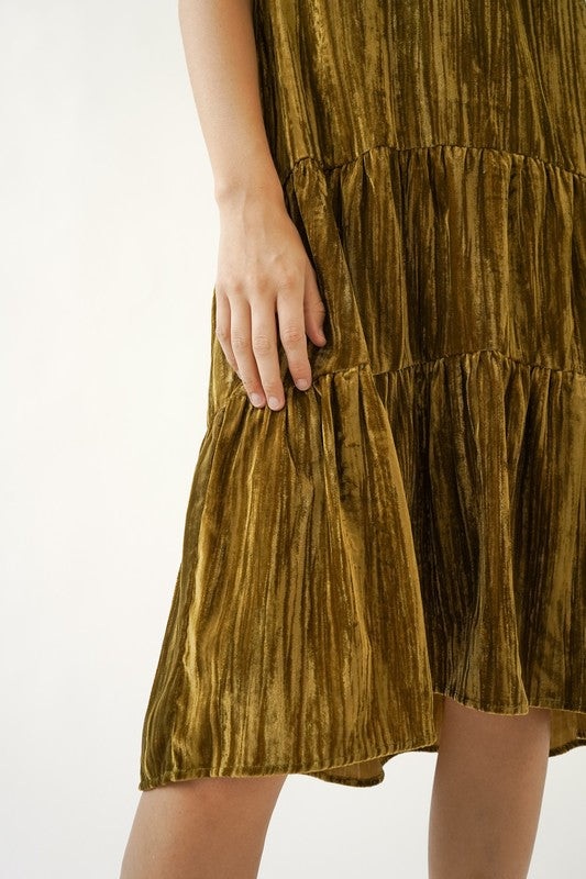 Crush grooving in the retro-chic velvet maple-tiered midi dress! Home for the Holidays just got better! Style this moss green show stopper up or down with booties or sneakers. Sleeves velvet dress.
