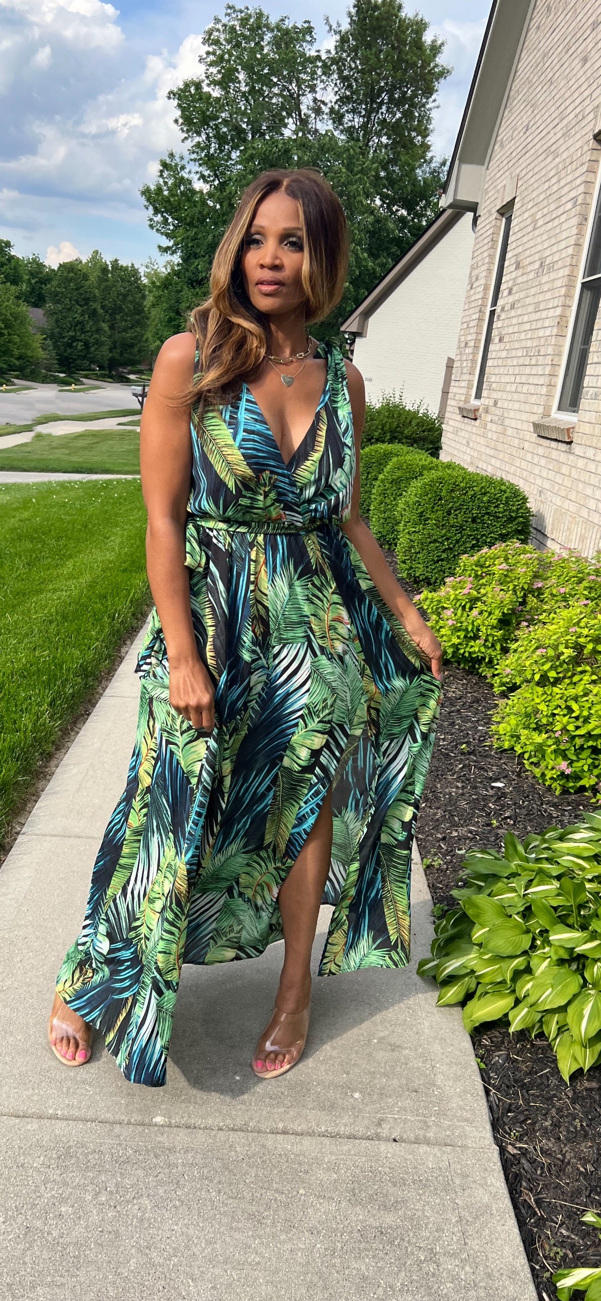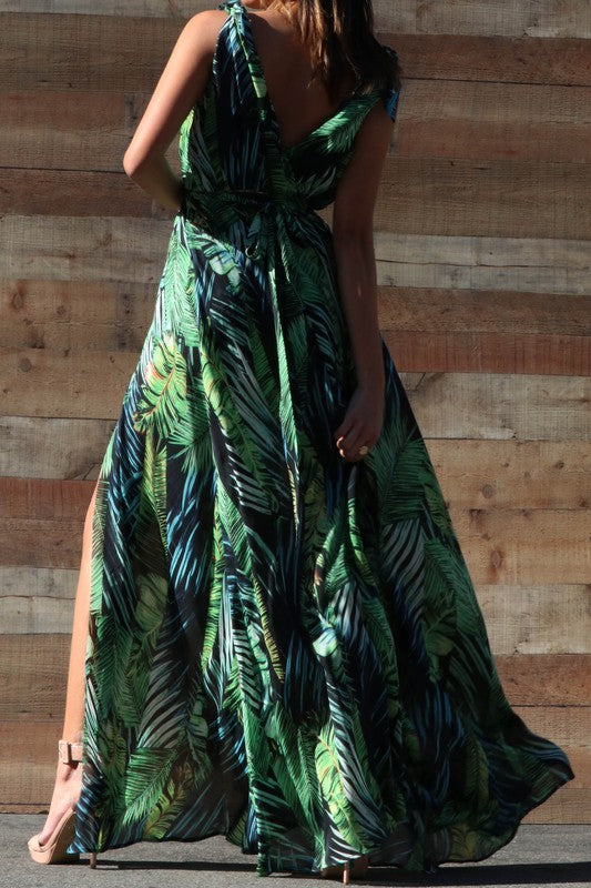 This beautiful multi print maxi is stunning. V-neckline dress front and back, sleeveless tie detail. Skirt slit. Elastic at wait for the perfect fit and comfort with a self tie belt. Stylish black multicolor. Vacation style. It’s Maxi dress season and this style is for you.