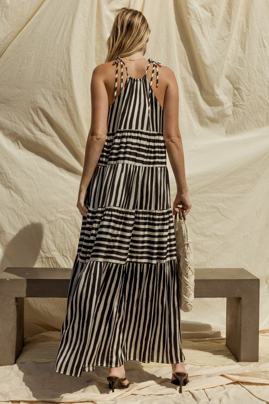 Feel effortlessly stylish in this Geo Striped Long Dress. Styled from 100% polyester, this long dress features striped print, evase design, halter neck, thin-straps with bow closure, thin-straps with bow closure.