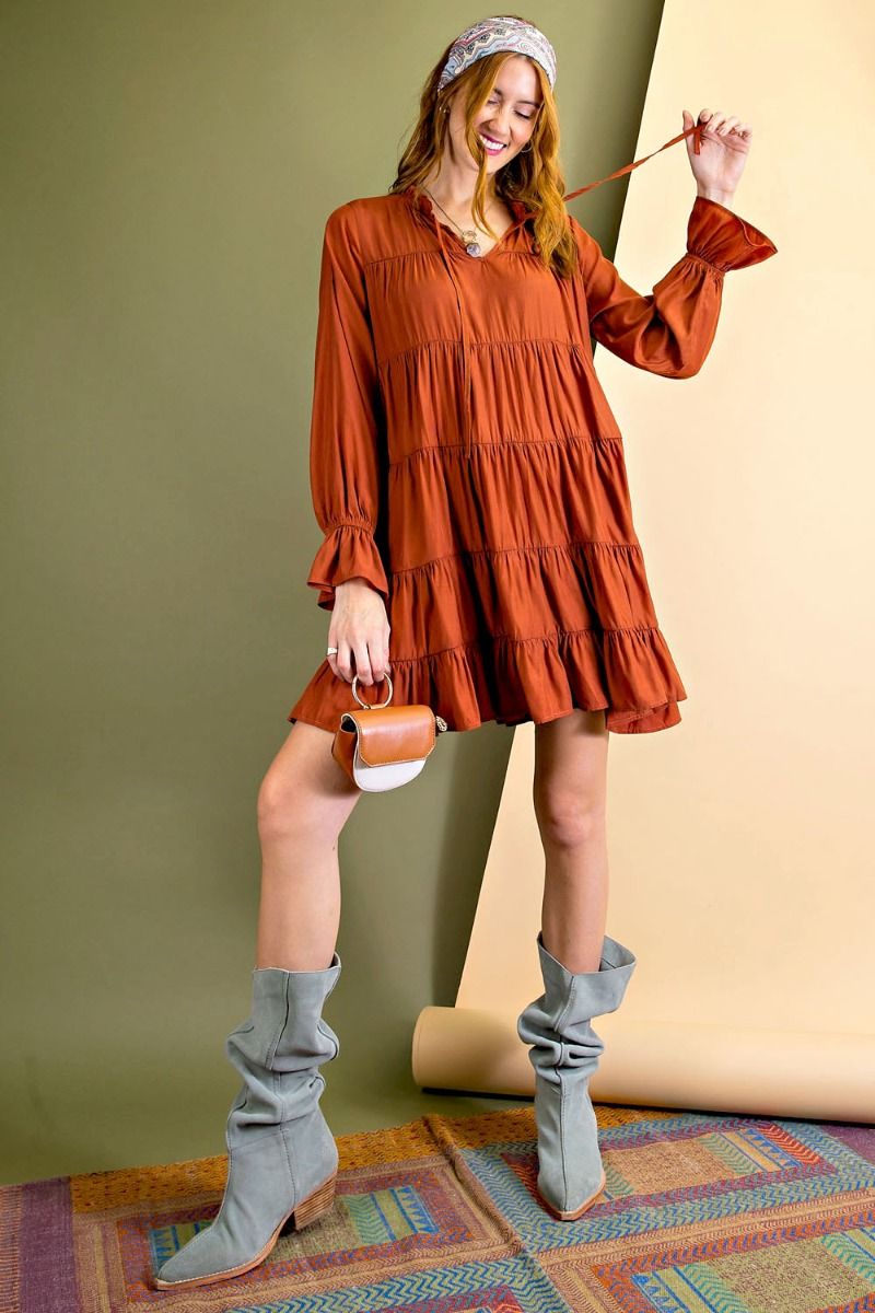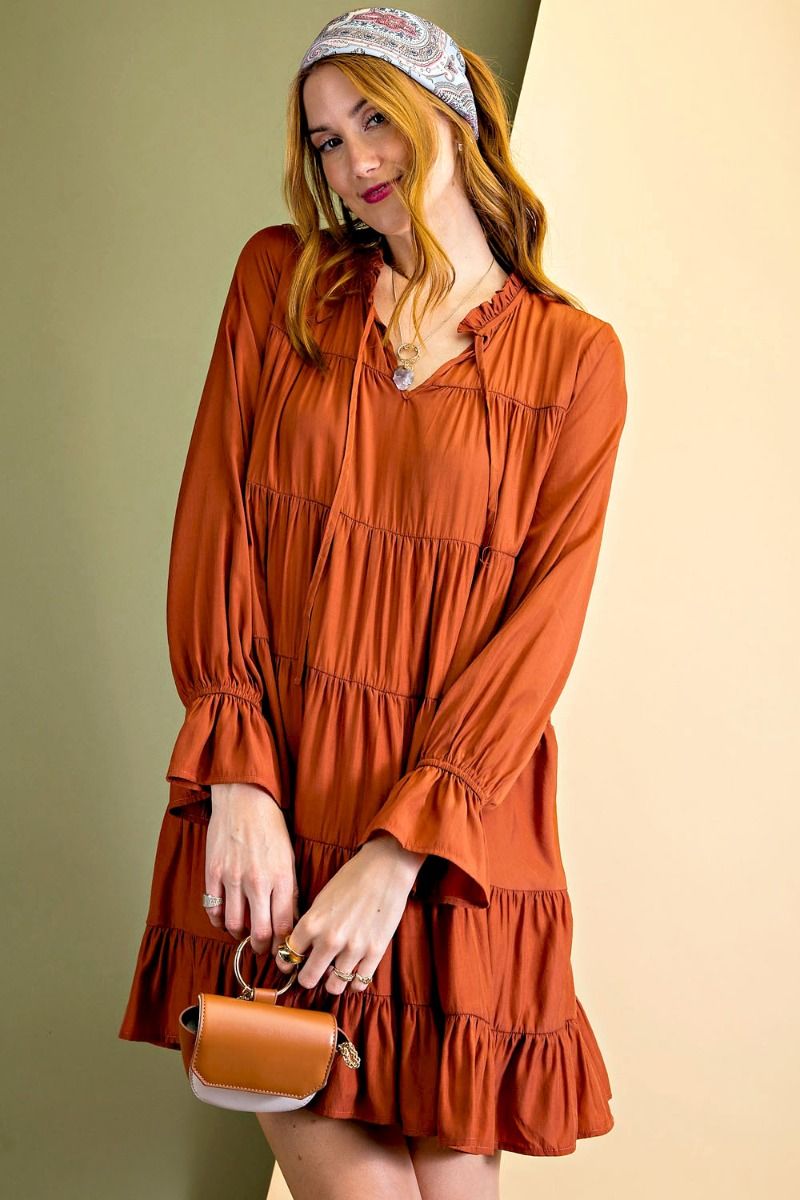 This style is long on comfort and sis, simplicity is the spice of life. Vibrant rust color long sleeve silky satin ruffle dress is flattering on all body types. Can be styled as a tunic top. Get ready to shine! Easy care