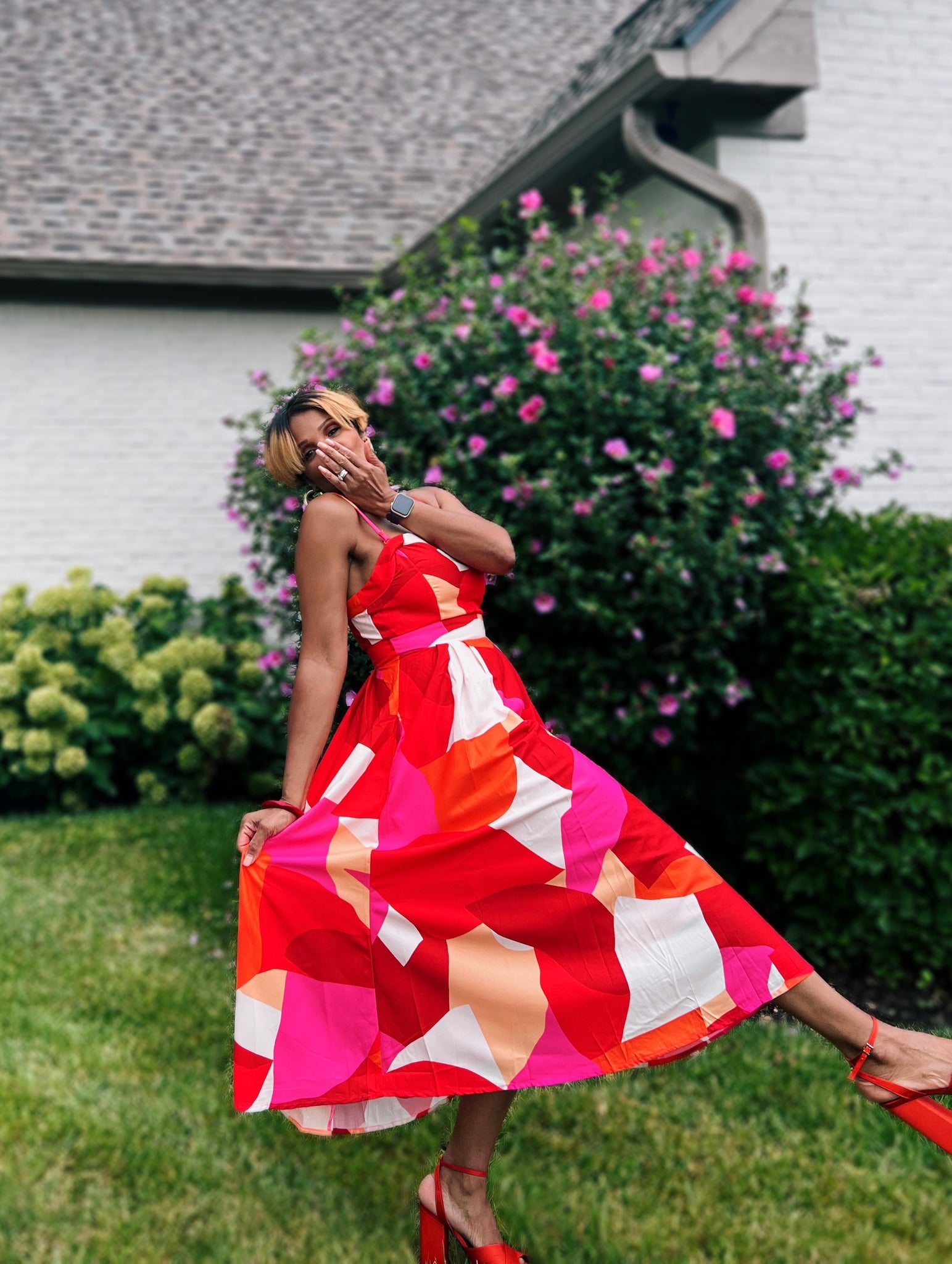 This vibrant, multi-color, A-line midi-dress works great for day or night! Features a straight neckline and adjustable, removable straps. This full skirt looks amazing on its own or add a POOF skirt under for drama.