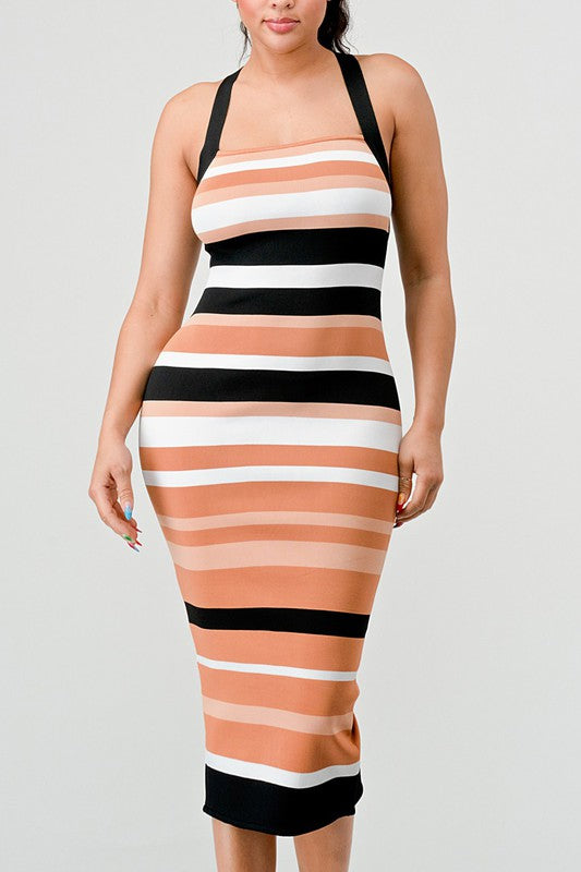 Chic and sexy body-con dress, zipper cross back halter midi dress strip print