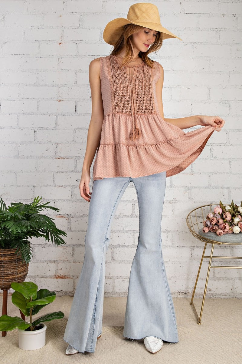 Baby we got you! Obsessing over this new baby doll top. This tiered ruffle top ties at the top and is so flattering on any body type. Sis. This one is a hit. Super comfy easy care. Machine wash hang dry. Dusty Rose sleeveless baby doll top.