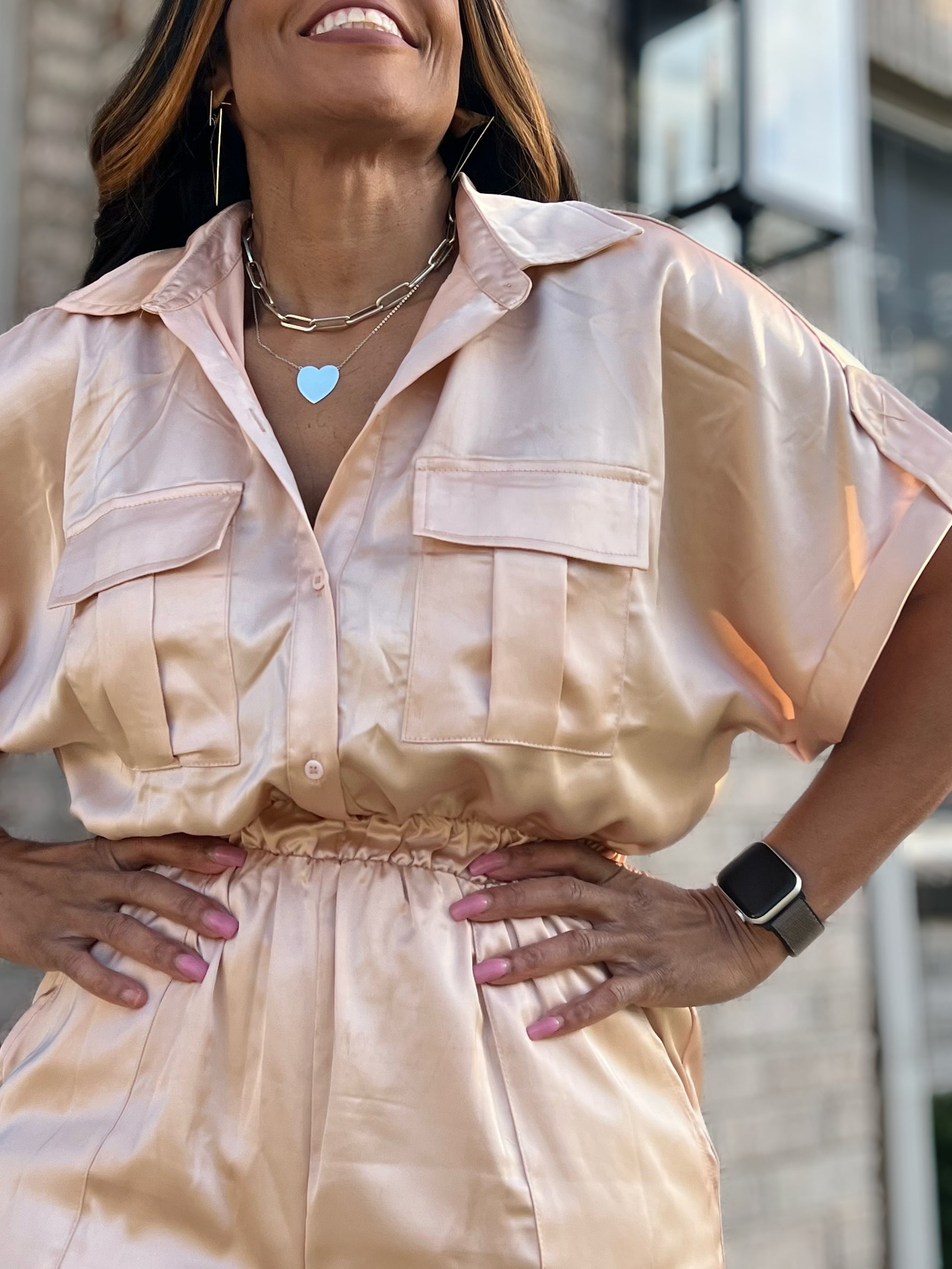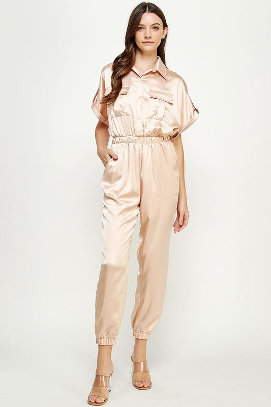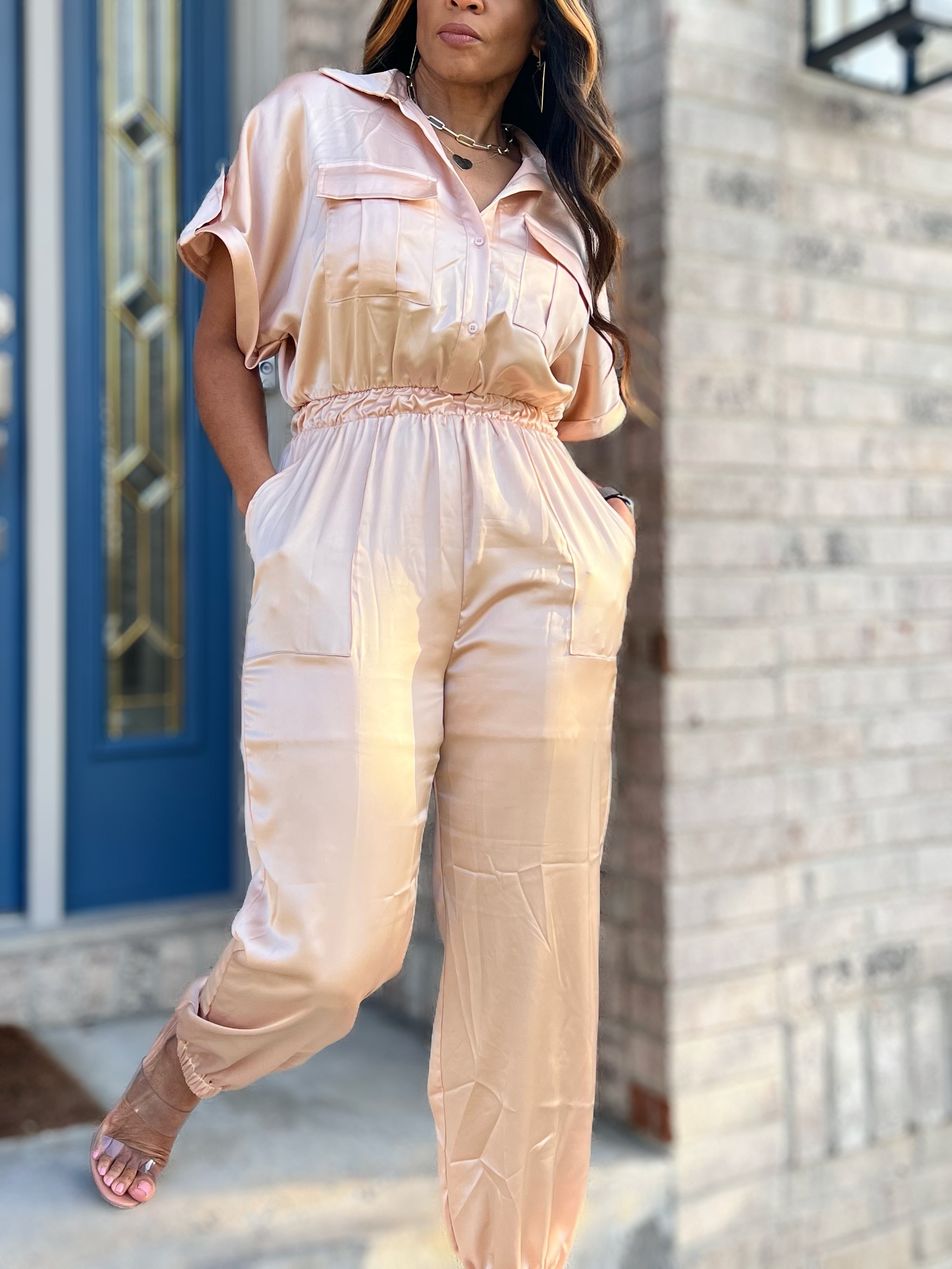 The elevated casual cargo jumpsuit is the perfect girl on the go look. Satin finish, elastic waist and jogger ankle. Size up for this one. Dress up or down