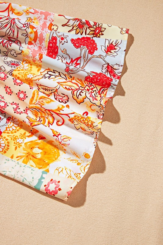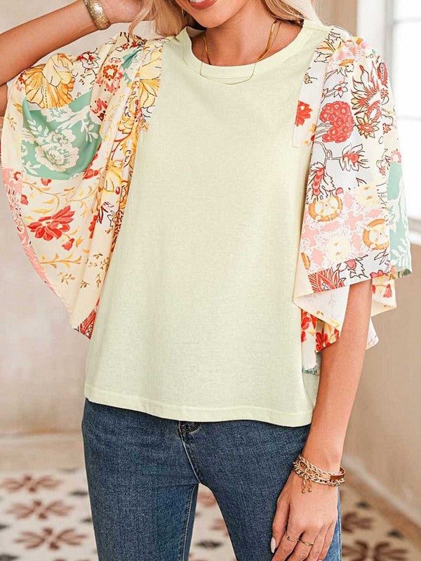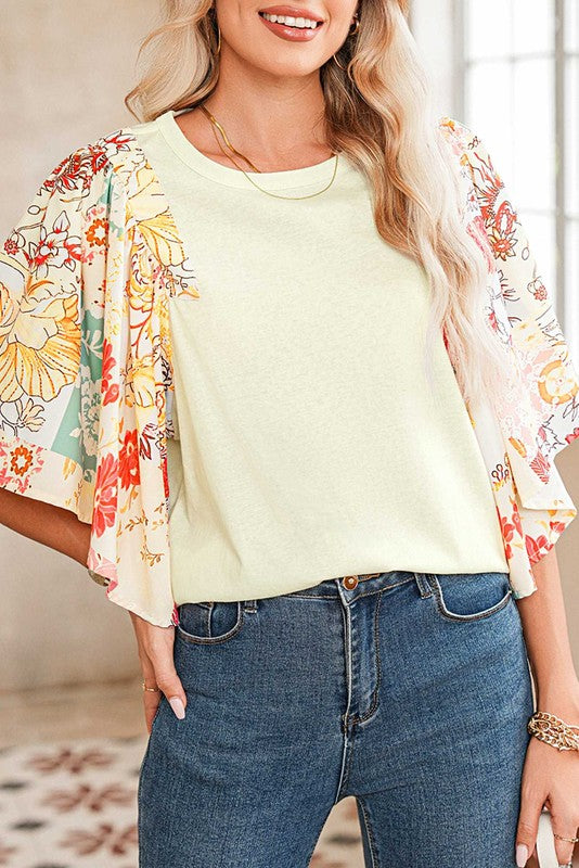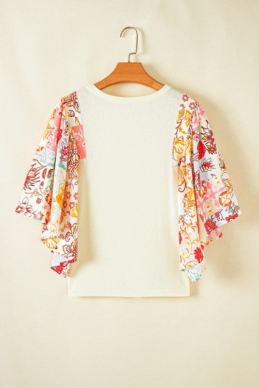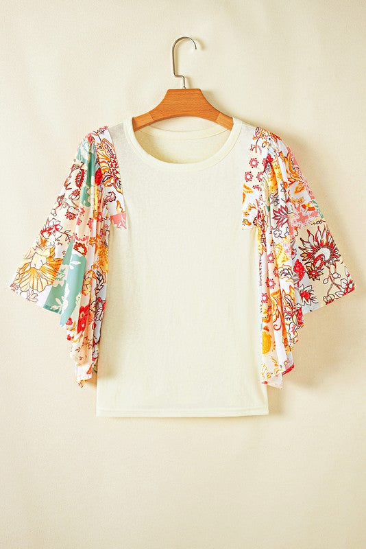 Cotton Beige Floral Patchwork Angel Sleeve Blouse