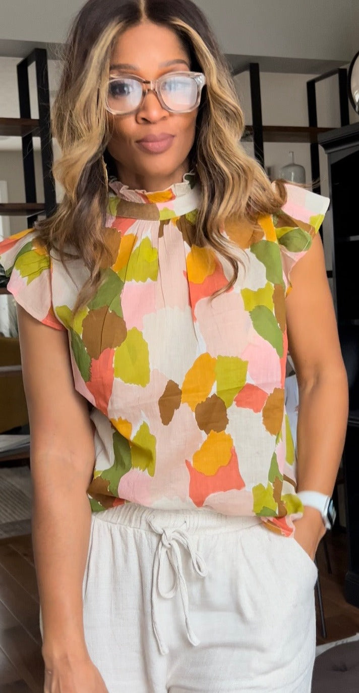 Soft classic women’s style. Butterfly sleeveless mock neck green multi print top. It’s the perfect day out top dress it down with jeans add a blazer for business and go. Todays style for you. Easy care cold wash line dry. Also styled with( Sabrine wide leg pants or Emma wide leg pants)