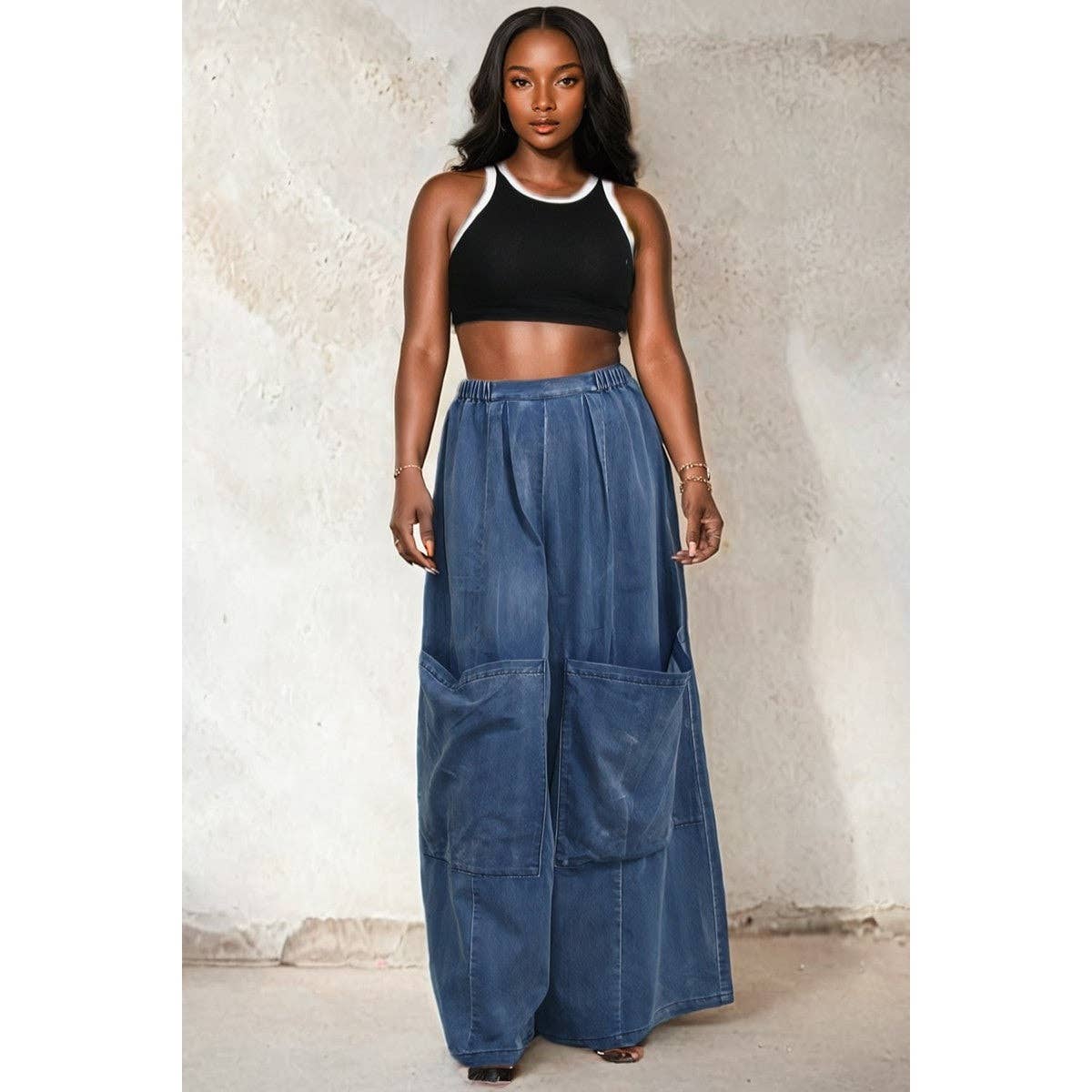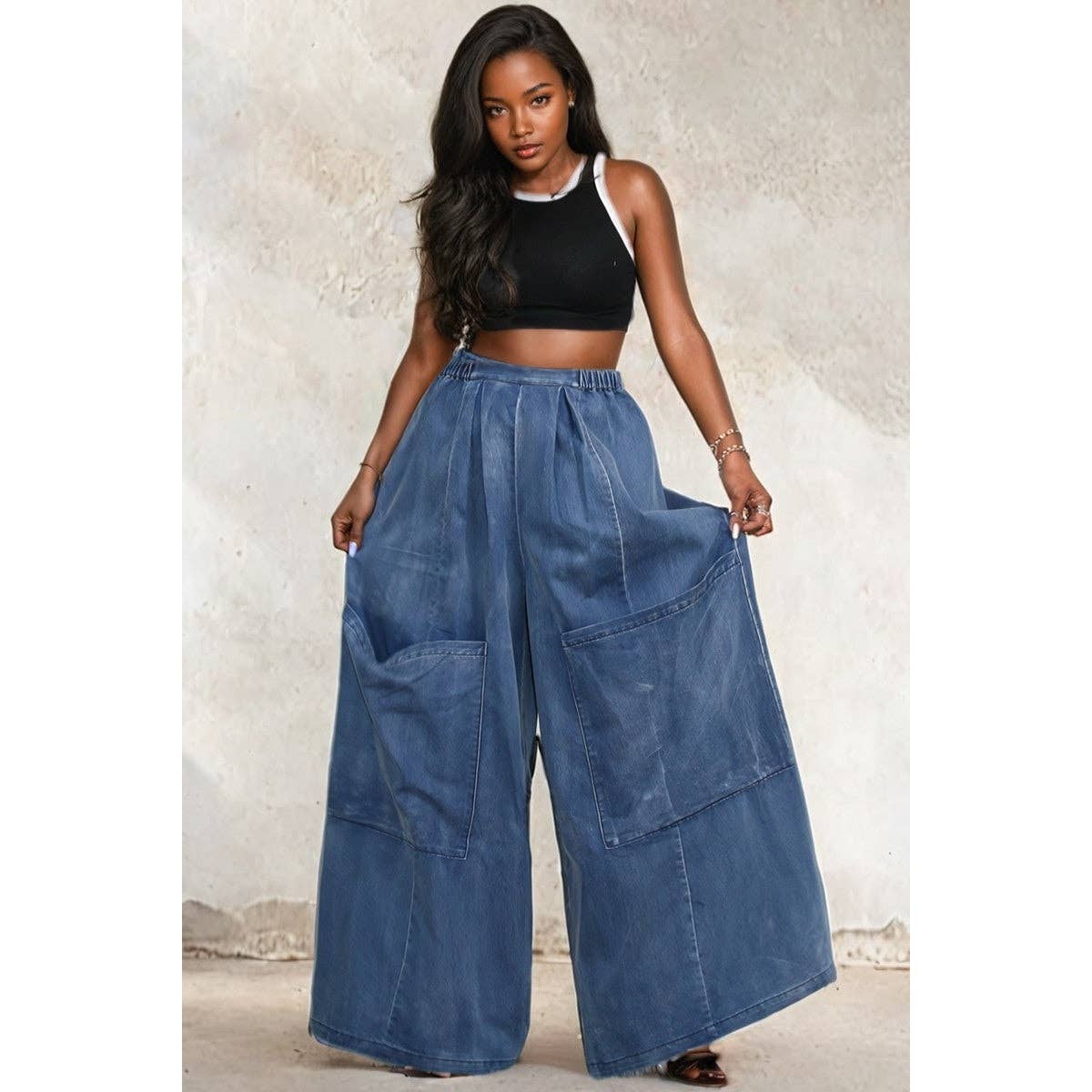 These Indigo Voyager Wide Denim Pants are a contemporary take on classic denim with a utilitarian twist. The high-waisted design accentuates the waist while providing a flattering fit. Featuring large, prominent patch pockets on the front, these pants are both stylish and functional, offering ample storage space. The ultra-wide legs create a dramatic, flowing silhouette that combines comfort and modern fashion sensibilities. Made from durable, high-quality denim.