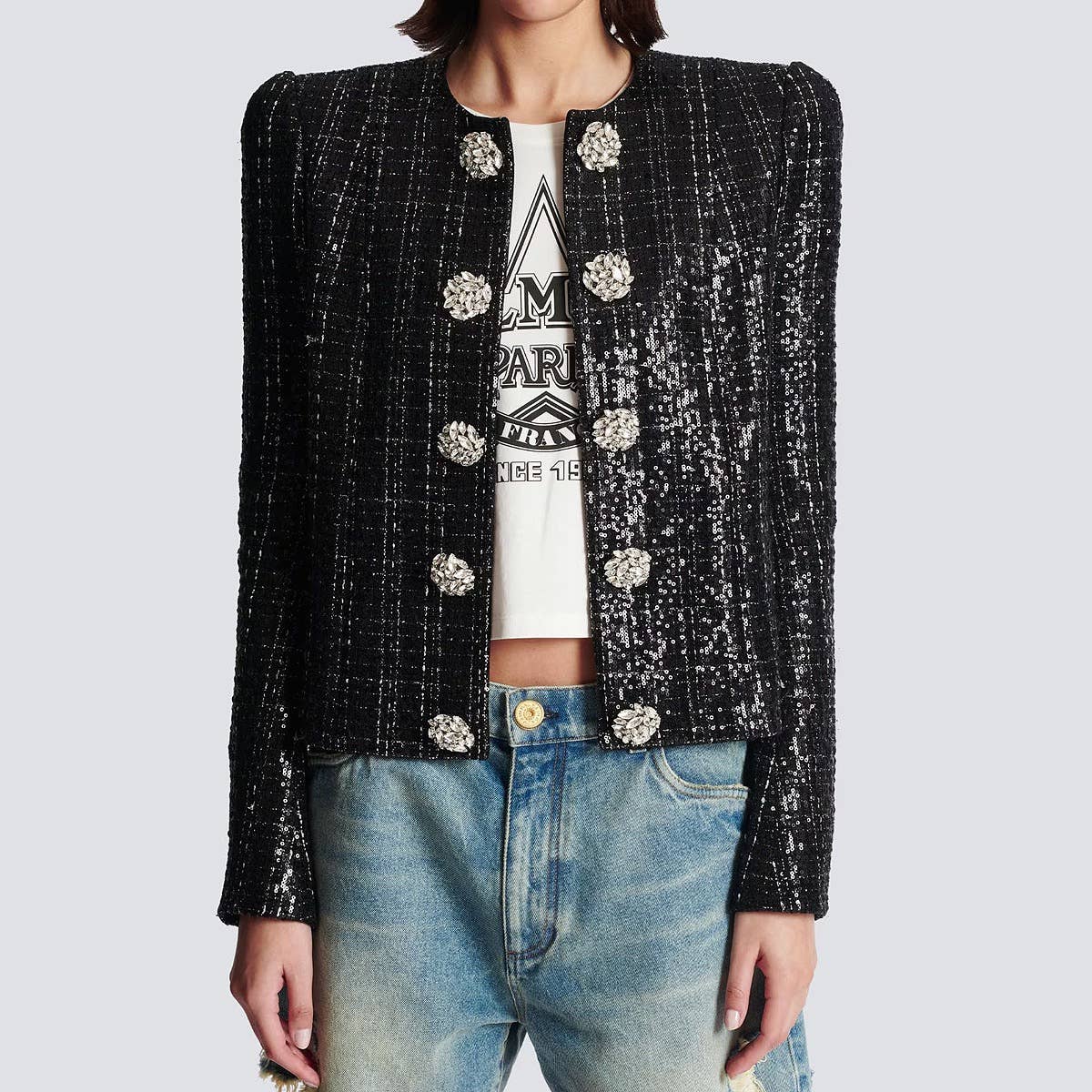 Unveil the essence of transitional style with our Spring/Autumn women’s jacket, a masterpiece intricately inlaid with shimmering sequins and diamonds. Crafted for the fashion-forward individual, this top is not only a statement piece but also ensures comfort and durability.It offers a blend of trendsetting style and timeless sophistication that appeals to a diverse clientele seeking to elevate their fashion game.