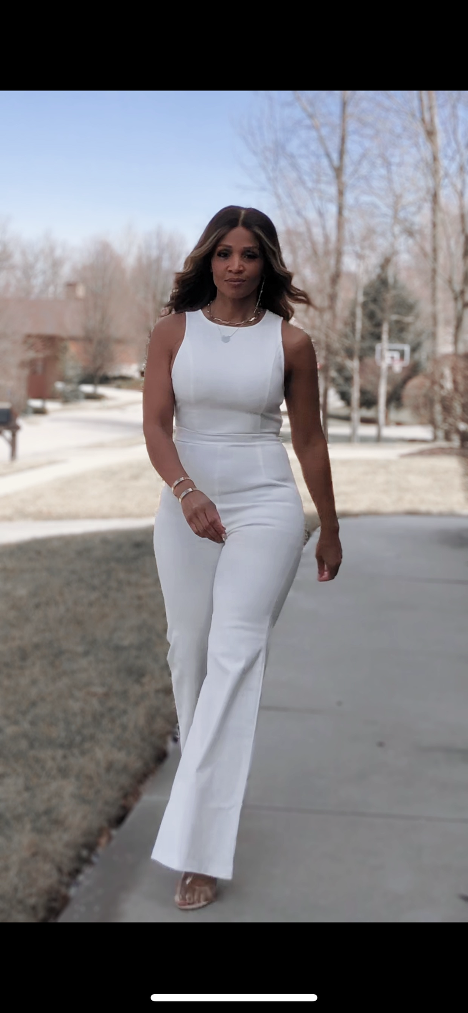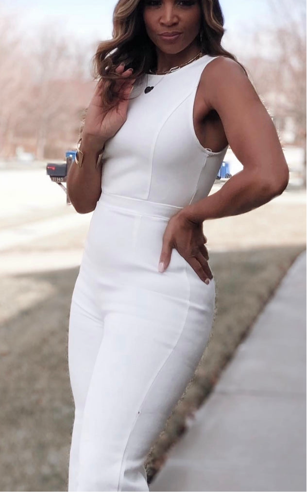 An absolute dream in white. Get ready to turn heads in this white stretch, body-hugging jumpsuit in white denim. Zipper back closure, flare leg, crew neck. It’s white party season. Approx inseam 28’’ Easy care hand wash cold line dry.