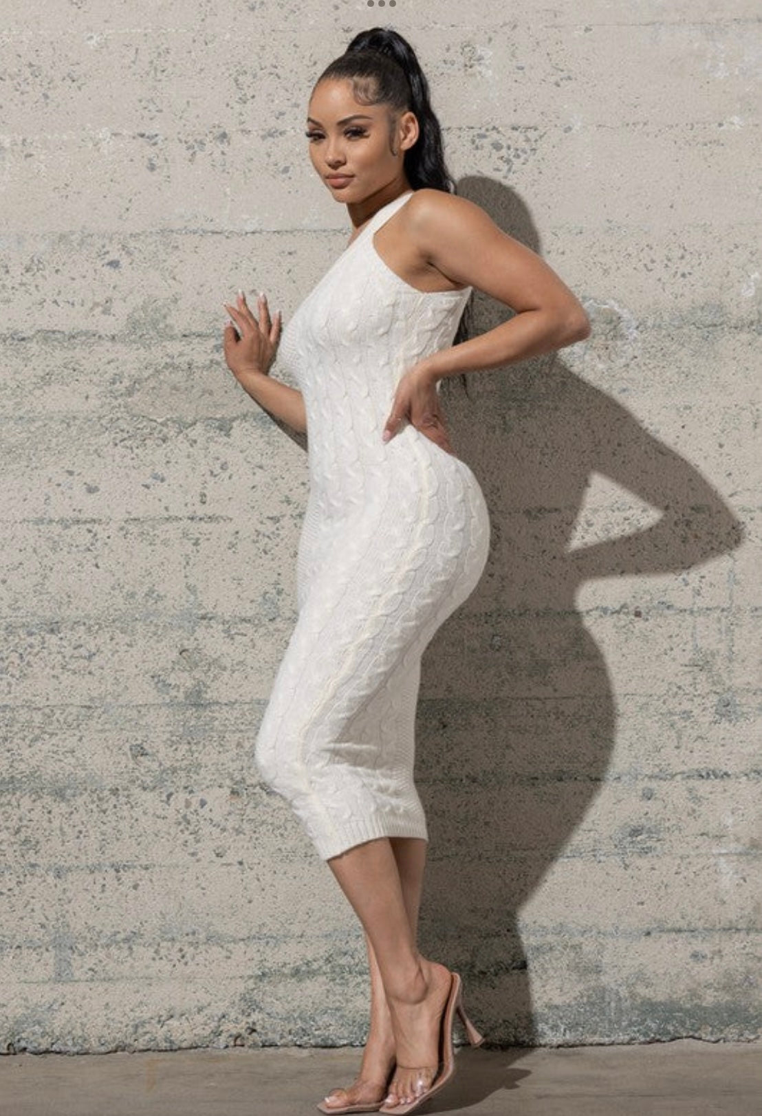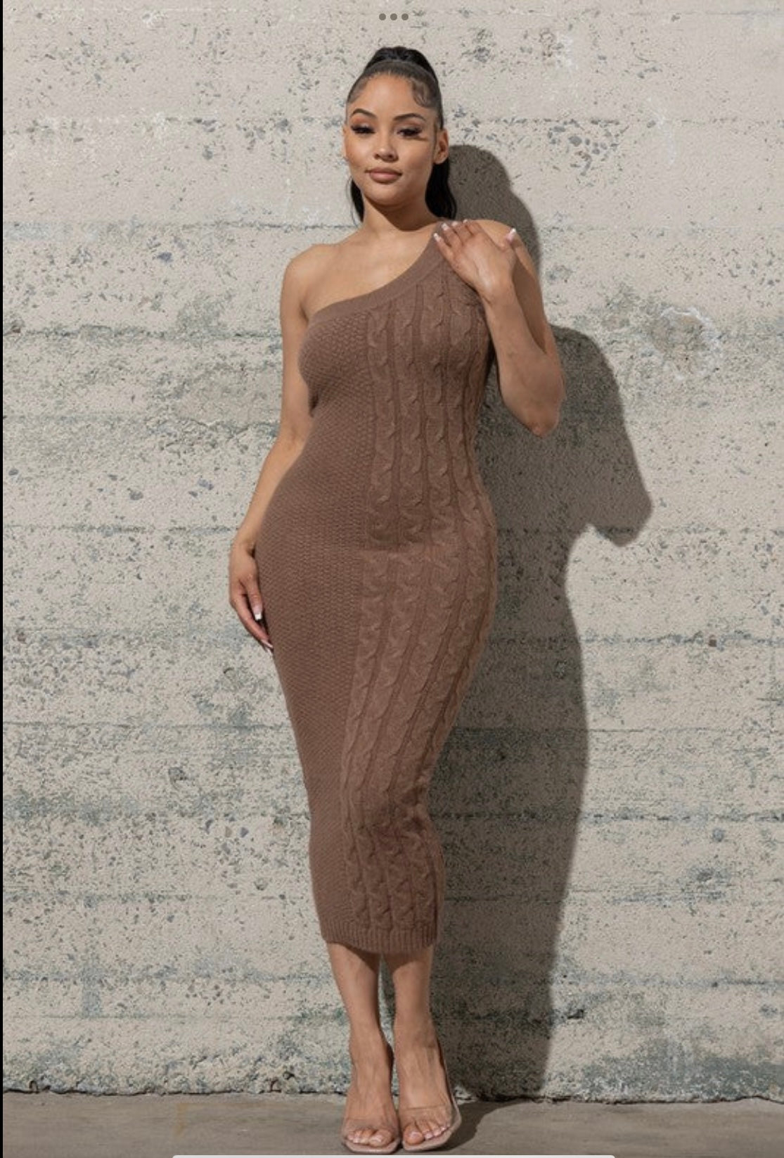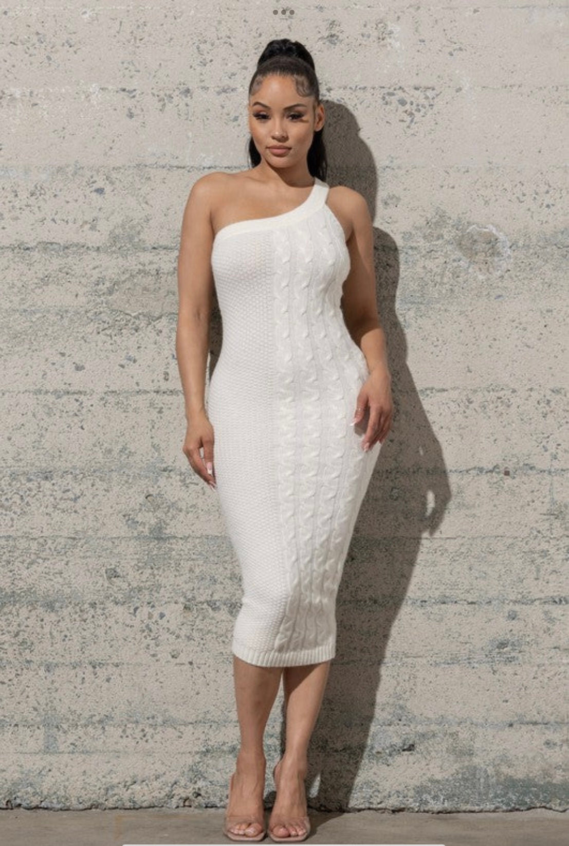 Chic one-shoulder bodycon cable knit sweater dress. Stretchy and supportive sweater dress. Cocktail party dress or dress down with sneakers