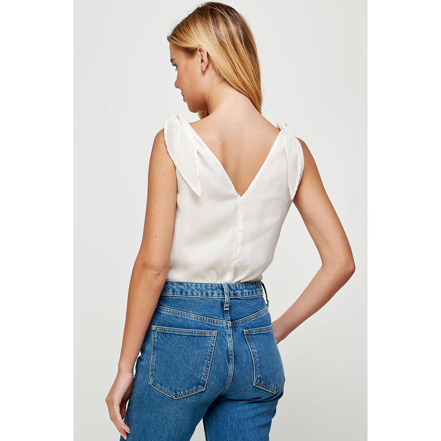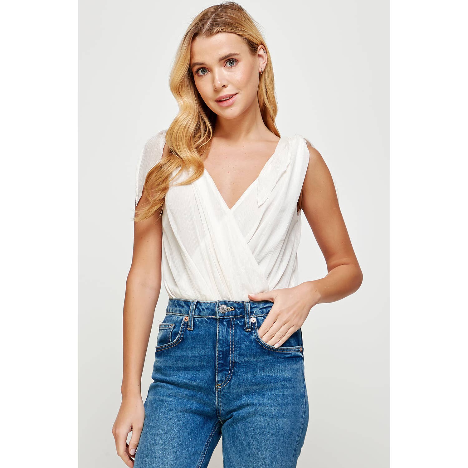 Tie bodysuit in textured lurex shimmer crinkled yoryu chiffon fabric . This style features lining at front bodice, trendy ties at shoulders, classic surplice V neck with snap button, and snap button closure at the bottom.