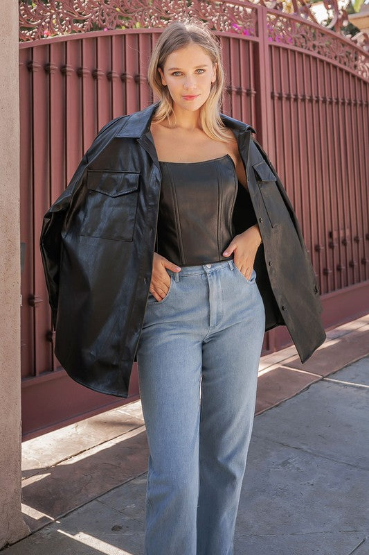 A closet staple corset in faux black leather. This chic style features a minimal sweetheart neckline. Form hugging, strapless corset is designed with bonding. Back zipper closure with hook clasp. Style alone or over a top or dress. Style for you.