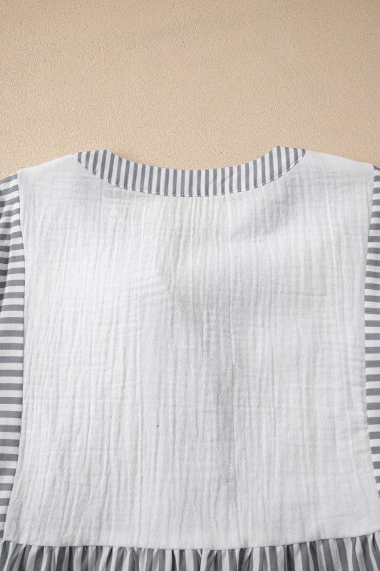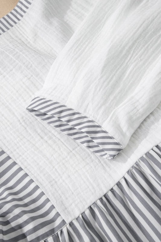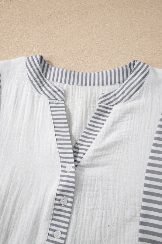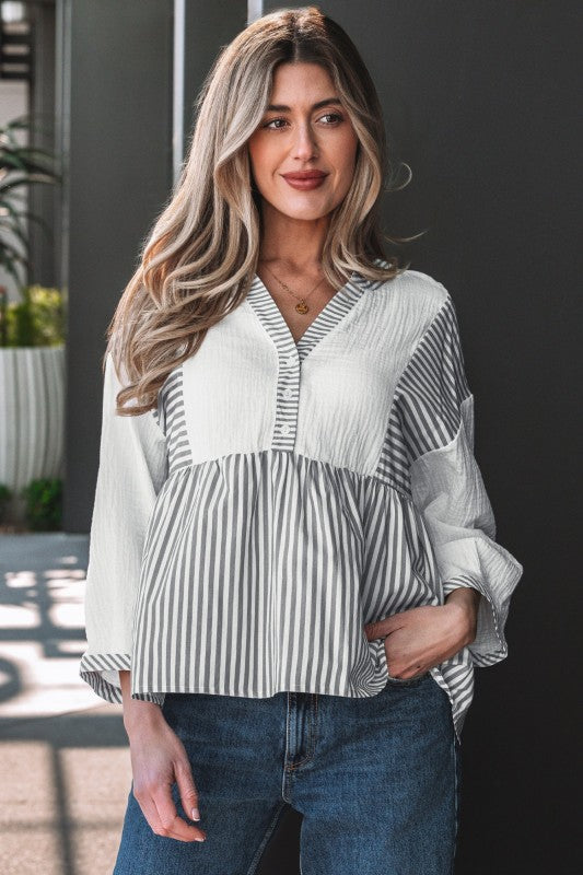 Zahra Bracelet Sleeve Babydoll Blouse is made for real life—easy to wear, easy to love. Add a playful touch to your wardrobe with this blouse. Featuring a color palette with stylish striped details. It has quarter sleeves and a split neck with button closures. Perfect for mixing and matching with your favorite bottoms. Material: 100%Cotton.
