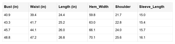 Fits true to size. Measurements included in our Size Chart